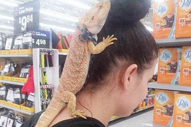 Some people just can’t bear to leave their pets behind. Clearly, this woman decided her reptilian pal couldn’t be left home alone while she ran errands. Seeing the lizard perched on her head, you might think it suffers from separation anxiety. While this scene might be cute and captivating to some shoppers, it’s undoubtedly terrifying to others.