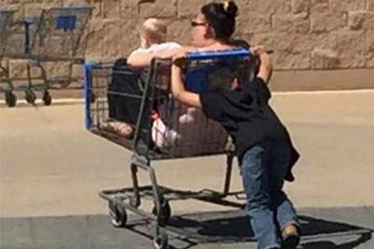 Is this a punishment or just fun and games? Check out this kid pushing their mom in the shopping cart while the baby’s inside. We don’t want to judge anyone’s parenting choices, but we can’t help but wonder about the reasoning behind this behavior.