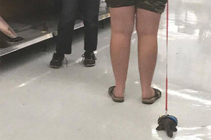 Bringing a turtle on a shopping trip really slows things down. Plus, turtles seem like they would prefer to be alone. Maybe this woman has separation anxiety from her turtle.
