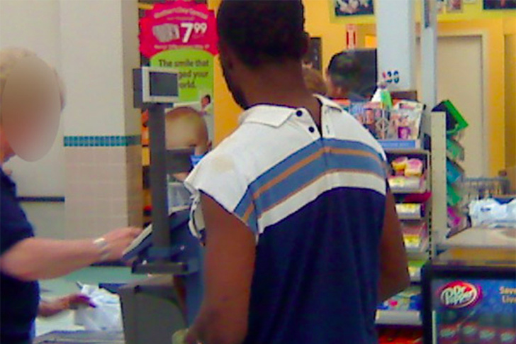 Our guess is that he was running late and didn’t notice his shirt was on backward… or did he? The cutoff sleeves are also questionable, and it looks like the shirt is a size too small. Someone needs to tell this man what not to wear!