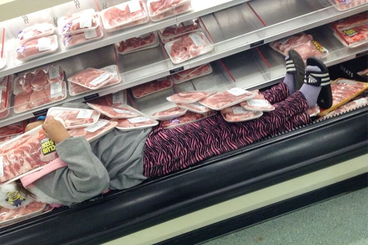 What we have to admire here is her choice to cover herself with meat in the refrigerator aisle. Of course, everyone has the right to make their own choices and have preferences, but this decision is truly out there.