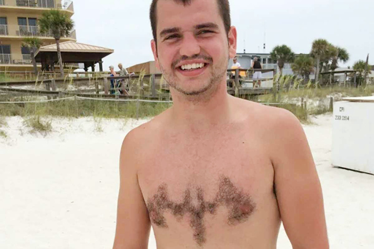 For some people, body hair isn’t just a natural thing or something to get rid of—it’s a blank canvas. Unfortunately, the “masterpiece” on this canvas doesn’t seem to be very impressive. But the man with this body hair design has a big smile on his face, and he seems really happy, no matter how good or bad his artistic creation is.