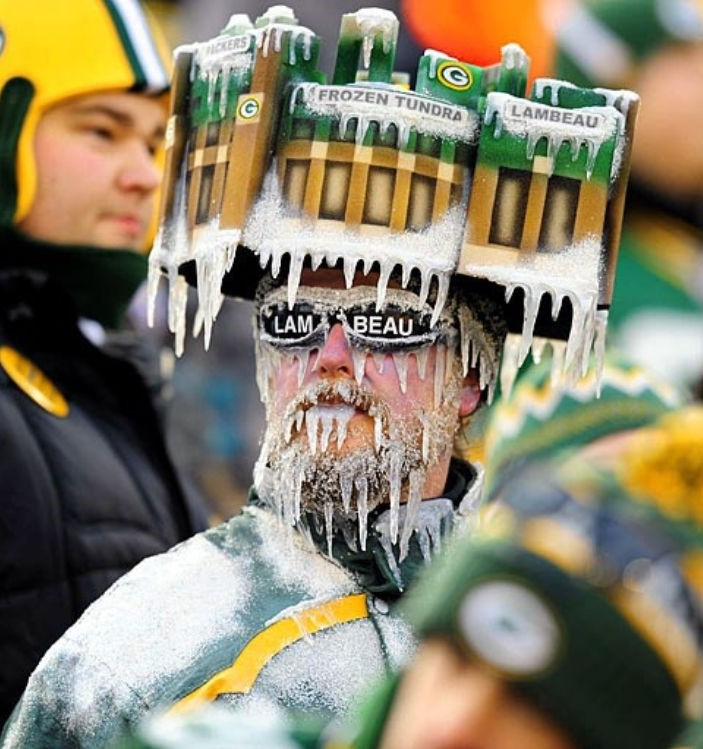 Every team needs its die-hard fans, but Green Bay Packers supporters take team spirit to legendary levels. This Wisconsin fan has literally embraced his home state’s frigid temperatures – crafting a headpiece that recreates a frozen stadium. His jacket sparkles with artificial snow, icicles dangle from his cheeks – a perfect tribute to those bone-chilling games at Lambeau Field’s “Frozen Tundra.”