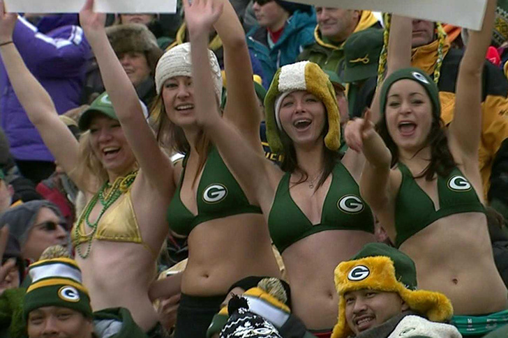 While the Packers battle on the field, these four fans prove toughness comes in many forms – including extreme cold resistance. While others bundle up in winter gear, they brave the elements in just bikini tops and hats – despite the obvious freezing temperatures.