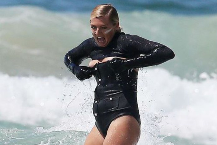 In surfing, the right wetsuit is essential – it protects from the cold and ensures freedom of movement. This surfer seems to have missed the memo – her bikini looks stylish but proves less than ideal for tackling rough waves.