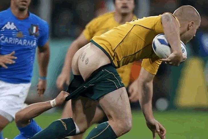 This scene on the soccer field is more farce than drama. Our brave soccer warrior, eyes on the ball, reaches out to pull up his teammate's pants. Like a magician pulling a rabbit out of a hat, he reveals his teammate's helpless buttocks.