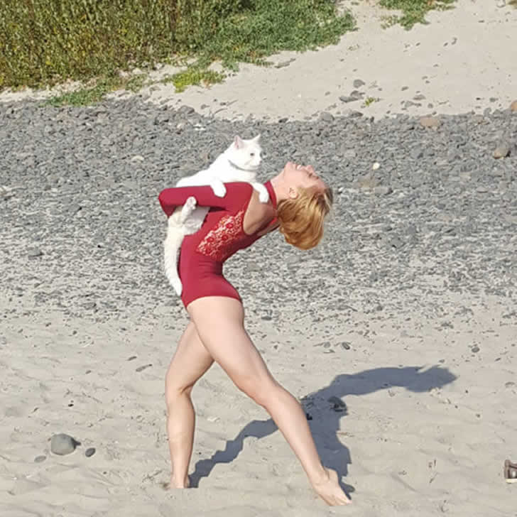 If you're a cat owner, you know that cats have a strange fascination with sand. After all, it's essentially their natural litter box. But in this photo, sand meets elegance. A dancer strikes a beautifully poised pose on the beach, but all eyes are on Buns—the glorious, curious cat who steals the show.
