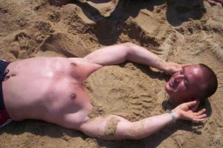 The world record for the longest neck is 40 cm, but this guy looks ready to smash it, with a little help from his friends and a pile of sand. Someone cleverly buried his face while another posed on top, creating the ultimate illusion: the man-neck hybrid. It's creative. It's bizarre. It's pure beachside brilliance. Who needs to swim or sunbathe when you can become an optical illusion?