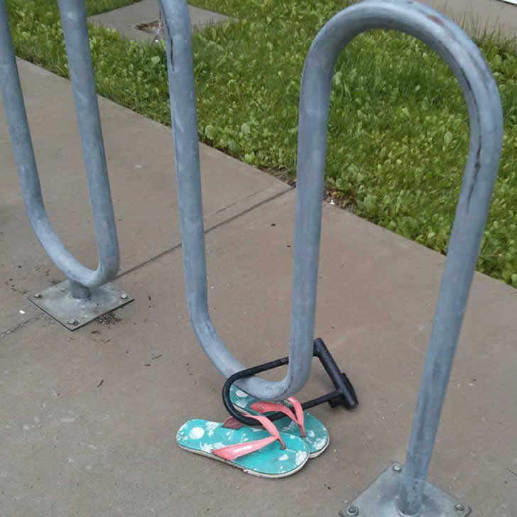 Some beaches are notorious for shoe theft, but this person wasn't taking any chances. She locked her cheap flip-flops with a literal padlock.