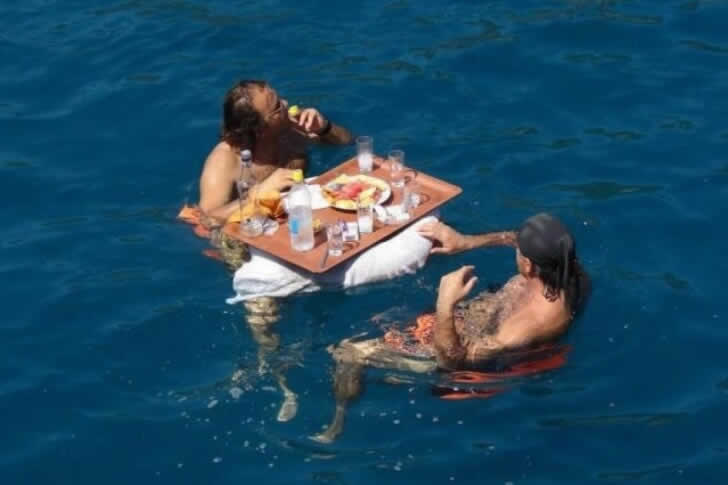 Picture this: two people peacefully floating on a tray of food, living their best snacking lives. Sounds idyllic, right? But it also looks suspiciously like the setting for a shark movie.