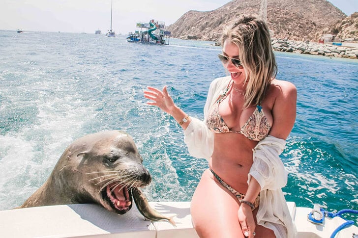 The woman’s smile shines as bright as the sun-drenched surroundings, capturing a moment of pure, spontaneous joy. It’s a scene straight out of an aquatic sitcom, where wildlife and humans share a brief, hilarious encounter on the high seas.