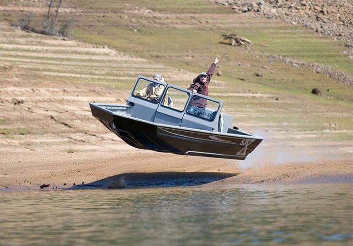 Who says boats need water to sail? In an astonishing twist defying all maritime norms, a boat is seen ‘sailing’ through the air over a flat, dry terrain, as if the laws of physics decided to take a day off. Two men are on board this gravity-defying vessel, their faces lit up with the thrill of this surreal adventure. They look as if they’ve just discovered a secret world where dreams float.