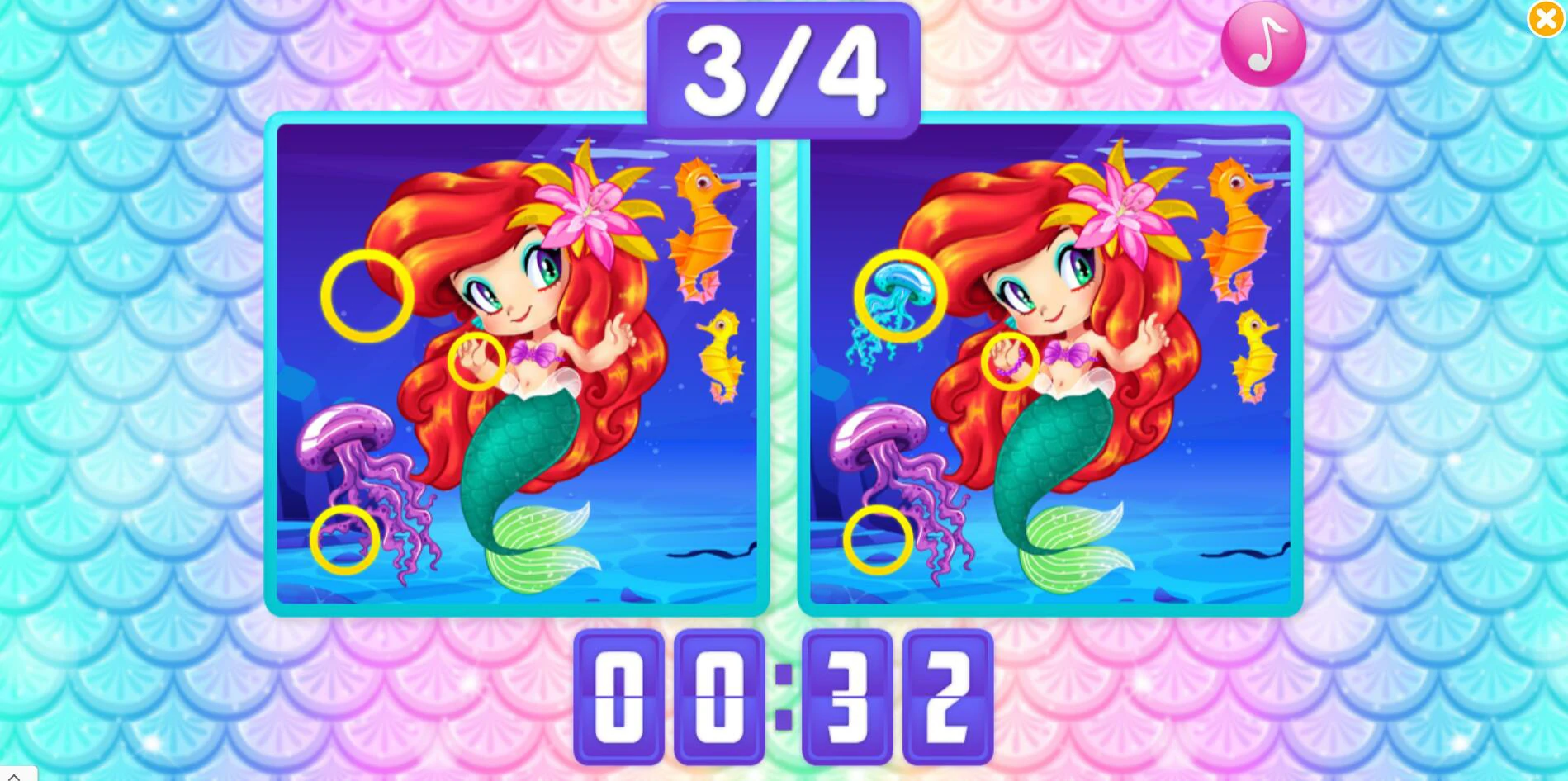 In the summer you want to go to the sea, swim and sunbathe! And it's time to play another fun game. You need to find differences in two almost identical pictures. You will meet cute little mermaids and sea creatures, and train your mindfulness. Go ahead, hurry up before the time runs out. If you can’t find all the differences the first time, don’t be discouraged, try again, you will definitely succeed!